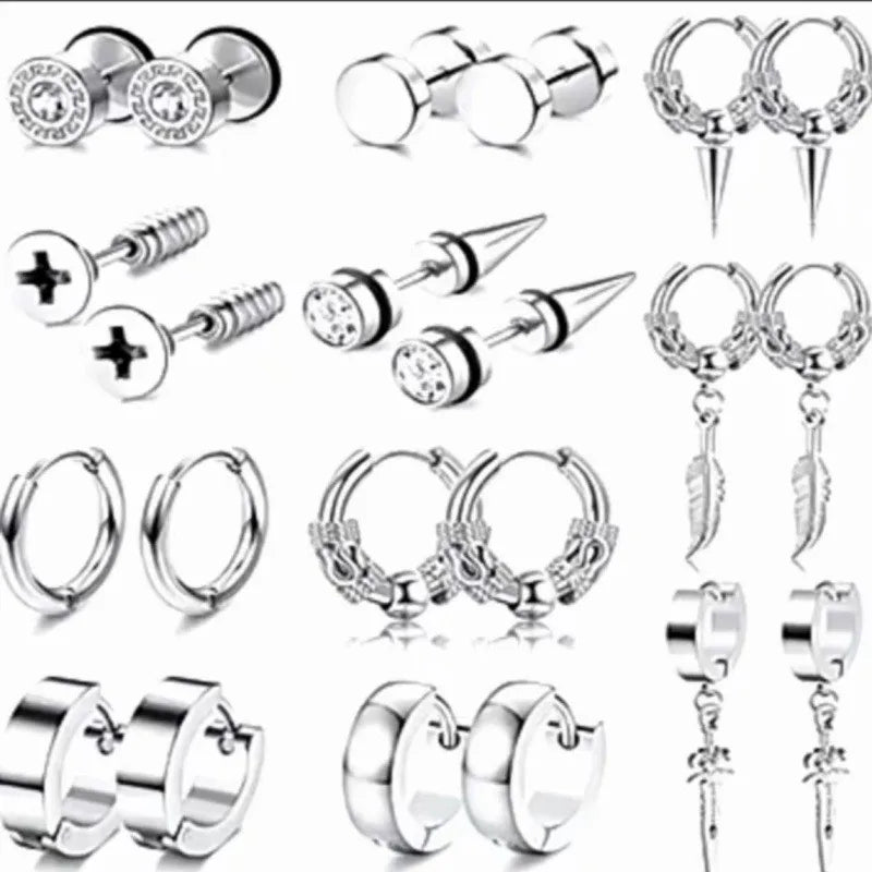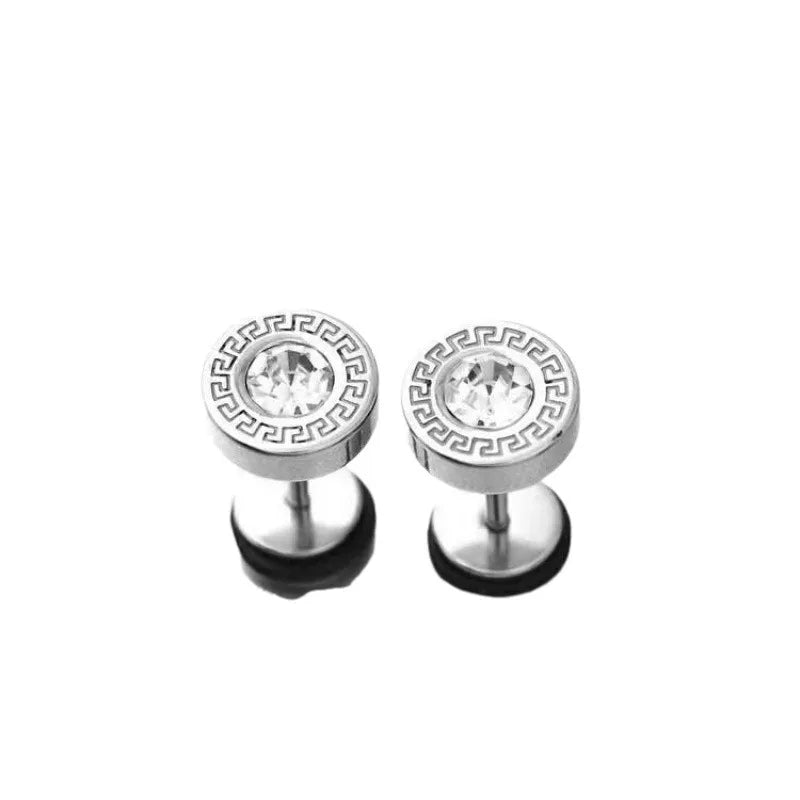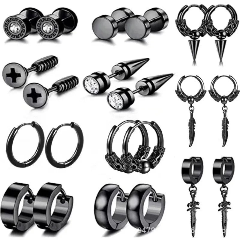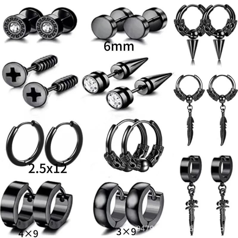 Stainless Steel Earrings Classic Men's Fashion Black Pierced Round Earrings Dragon Pattern Great Wall Pattern Jewelry Set - Steel 11 Pair suit