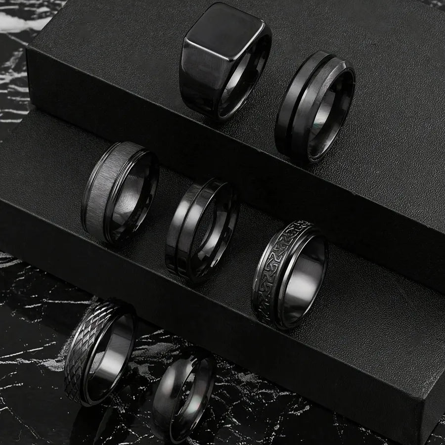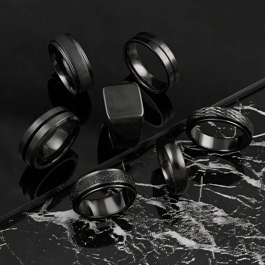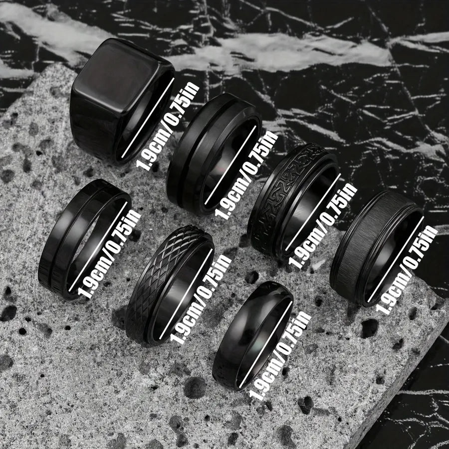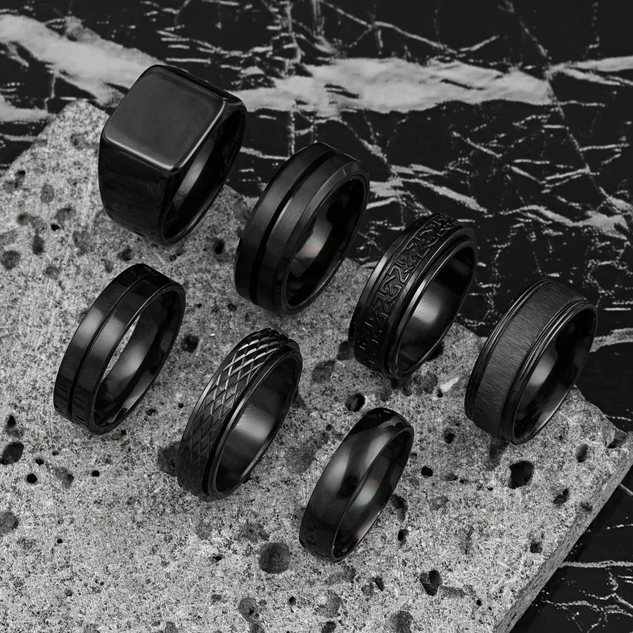 Trendy Stainless Steel Titanium Steel Ring Set Castable Rotatable Chain Rings Men's Hip Hop Punk Style Jewelry Accessories - 7 / Black Seven-Piece