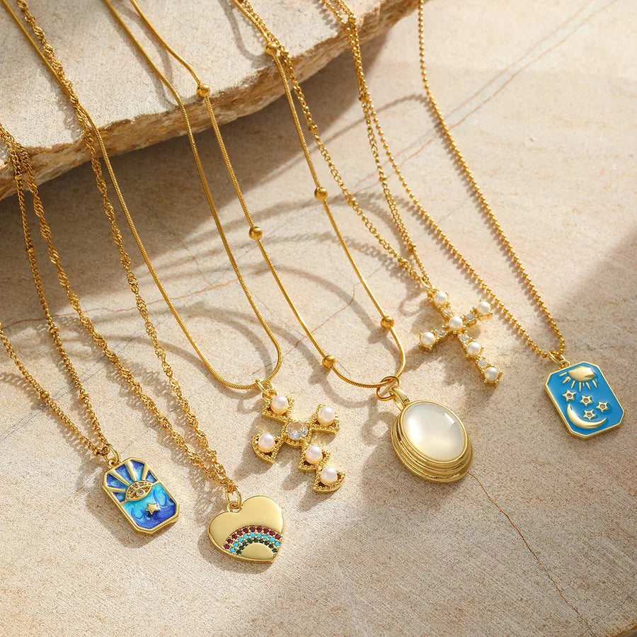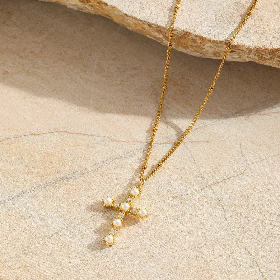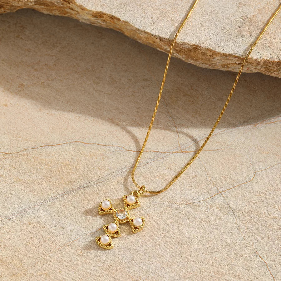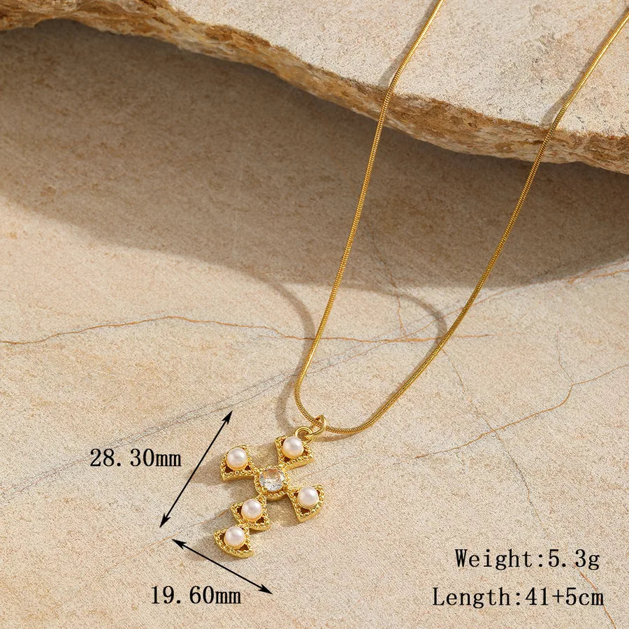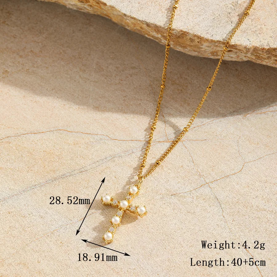 Wholesale Jewelry Casual Artistic Commute Geometric Cross 304 Stainless Steel Copper Imitation Pearl Zircon 18K Gold Plated Plating Inlay cable chain snake chain Pendant Necklace - 1